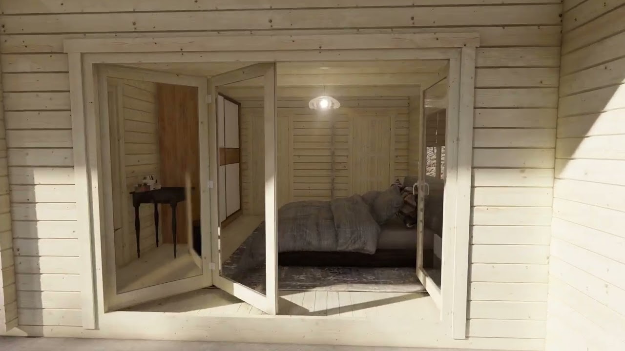 Das Blockhaus “Holiday S1” verfügt über drei große Falttüren, wodurch nahezu die gesamte Vorderseite des Blockhauses im Sommer geöffnet werden kann. Sie bieten damit nicht nur eine atemberaubende Aussicht auf den Garten, sondern schaffen auch eine nahtlose Verbindung zwischen drinnen und draußen. Neben einem großen Wohnbereich verfügt das Blockhaus über zwei Schlafzimmer mit separaten Eingängen durch die Falttüren und vier kleine Räume, die beispielsweise als Badezimmer und begehbare Kleiderschränke genutzt werden können. Alle Türen und Fenster sind doppelt verglast und mit in Europa hergestellten Tür- und Fenstersystemen ausgestattet. Um das Blockhaus das ganze Jahr über nutzen zu können, empfehlen wir den Einbau unseres Dach- und Bodenisolierungsset sowie einer Heizung.