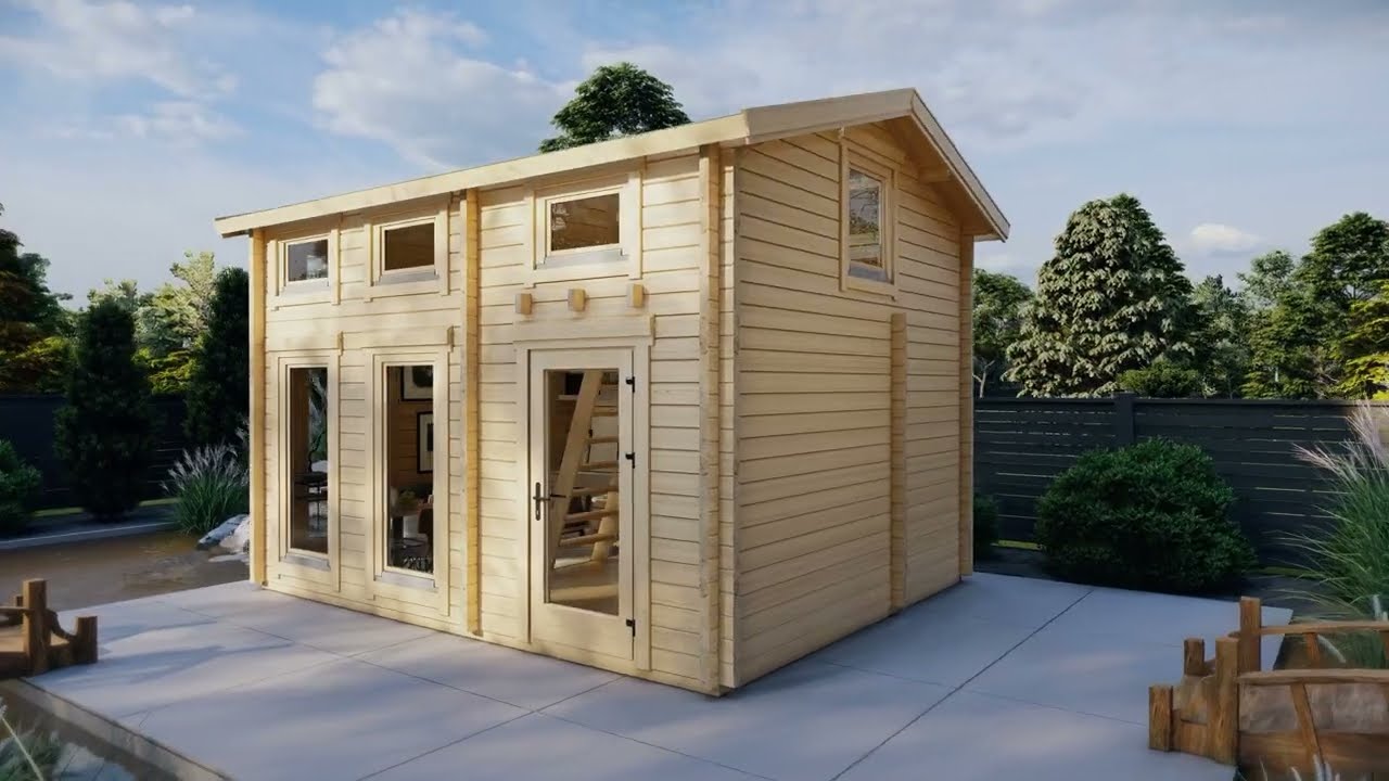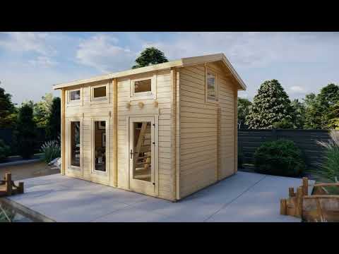 Das Gartenhaus Bruno 1 verfügt über ein 18 m² großes Erdgeschoss mit einem Wohn- und Esszimmer und einem Badezimmer. Über eine Leiter gelangt man auf den Schlafboden, der alternativ als Lagerraum genutzt werden kann. Somit eignet sich das Gartenhaus ideal als kleines Ferien- oder Wochenendhaus, Gästehaus im eigenen Garten oder luxuriöses Gartenbüro. 70 mm starke Wände und doppelt verglaste Fenster und Türen sorgen für Sicherheit und ausgezeichnete Wärmedämmung. Für den ganzjährigen Gebrauch empfehlen wir den Einbau einer Heizung und unseres Isoliersets für Fußboden und Dach.